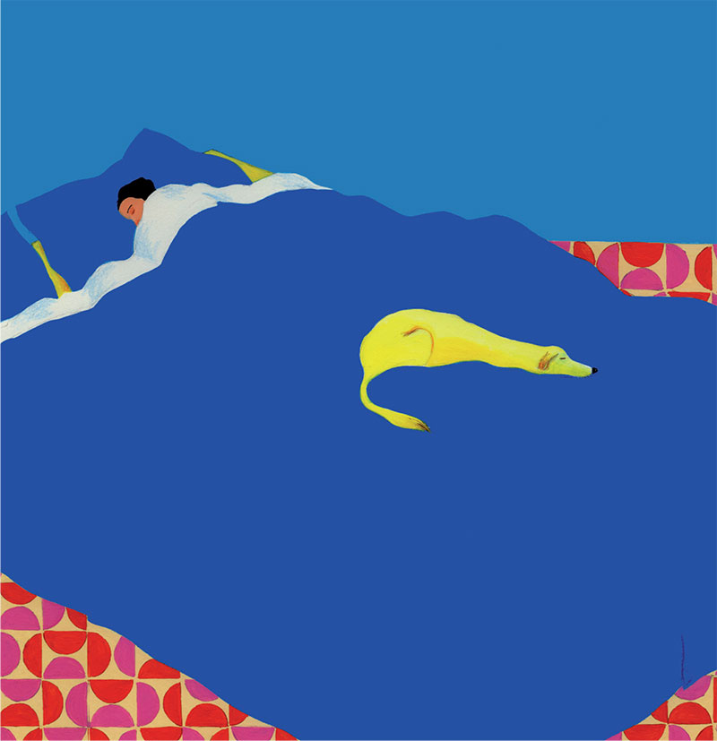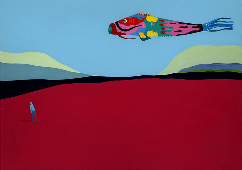L’espace clos d’abord : refuge idéal, protecteur, qui permet un véritable abandon au sommeil ; moins repos qu’état de traversée. La passerelle mène à de vastes étendues ouvertes sur l’infini, où les songes s’incarnent en carpes aériennes et colorées, inspirées des koinobori japonais, porteuses d’un imaginaire de force, de persévérance, de courage et de filiation.