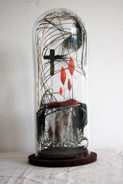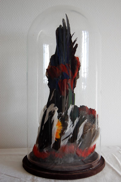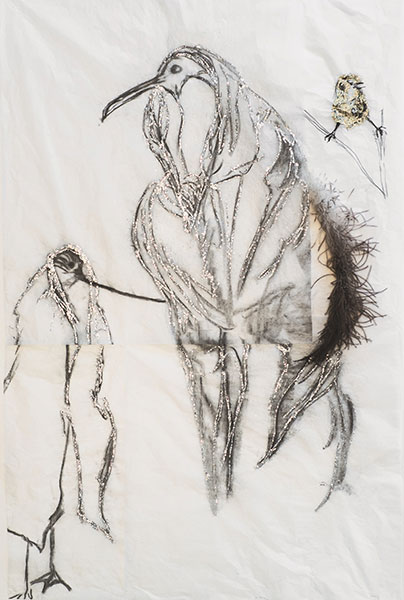 Le choix du medium plume est déjà fort dans sa relation à ce qui précède. Il est issu à la fois du vivant et de ce qui reste après la mort, soit de ce qui est conservédu vivant. Ce matériau, léger, coloré et rigide à la fois, s’allie à la transparence du papier, au marquage du crayon et à la lumière des paillettes.