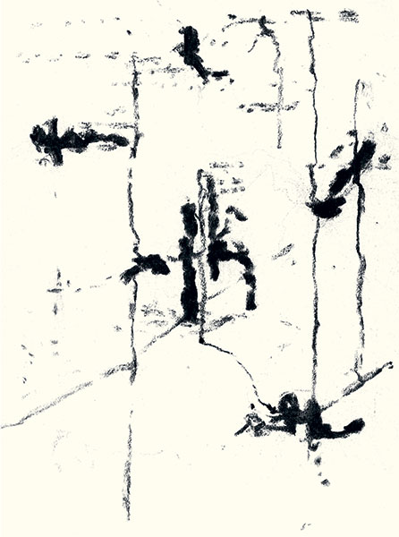 Le trait parcourt une cartographie illimitée, celle de l’arbre, foisonnant et toujours en mouvement. Des réseaux de lignes se croisent, se superposent et se répondent. Tantôt le dessin est effacé, il est sans trait comme une masse qui vient de loin et se concentre. Tantôt il se débarrasse de la forme et offre un trait d’une simplicité troublante, proche d’un idéogramme.